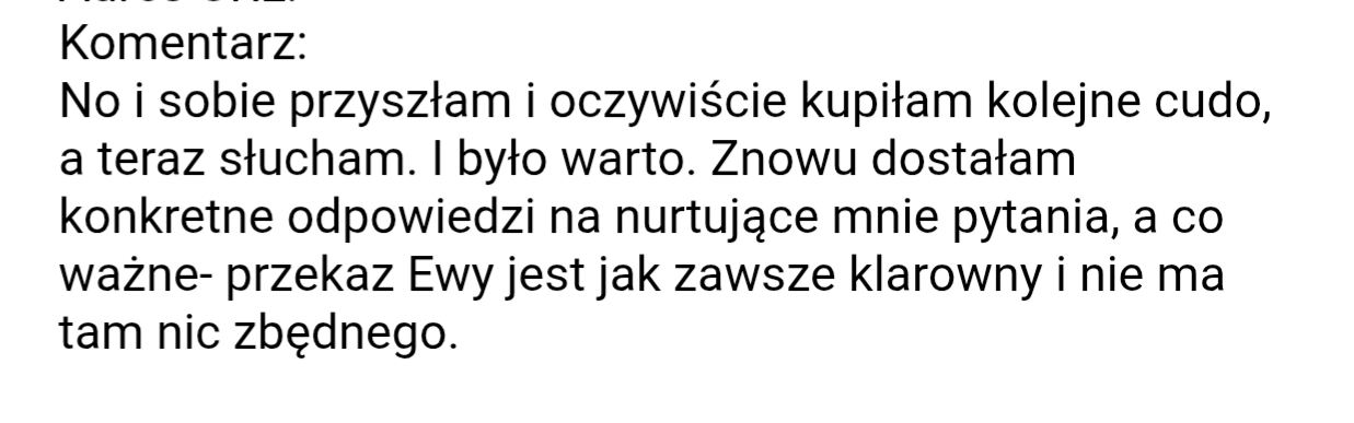 No i sobie przyszłam i oczywiście kupiłam kolejne cudo, a teraz słucham. I było warto. Znowu dostałam konkretne odpowiedzi na nurtujące mnie pytania, a co ważne- przekaz Ewy jest jak zawsze klarowny i nie ma tam nic zbędnego.