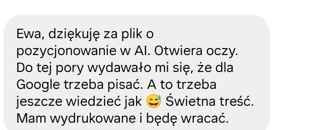 Pokazuję w nim krok po kroku, jak tworzyć treści, które AI rozumie i chętnie pokazuje jako odpowiedzi.